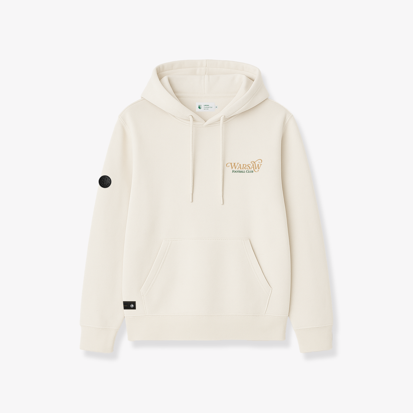 - Design: Haft “WARSAW FOOTBALL CLUB” z przodu (złoto + zieleń), nadruk Syrenki 3D z tyłu, gumowy detal “Legia” na rękawie, czarna metka na dole