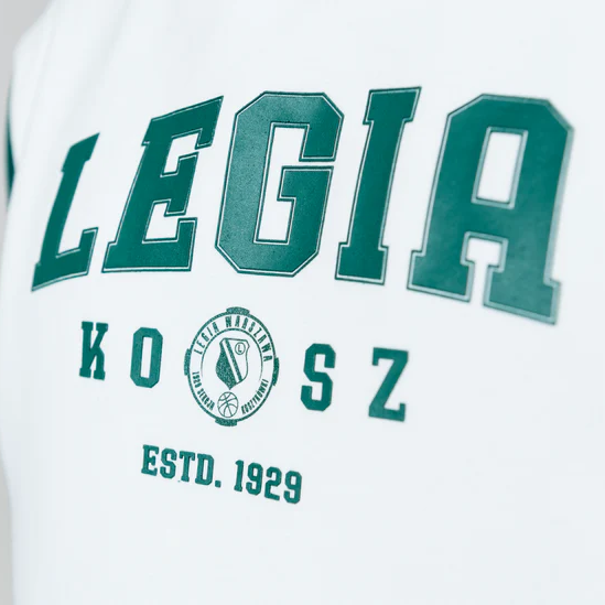 - Design: Biało-zielona kolorystyka, duży nadruk Legia Kosz, naszywka na rękawie.
