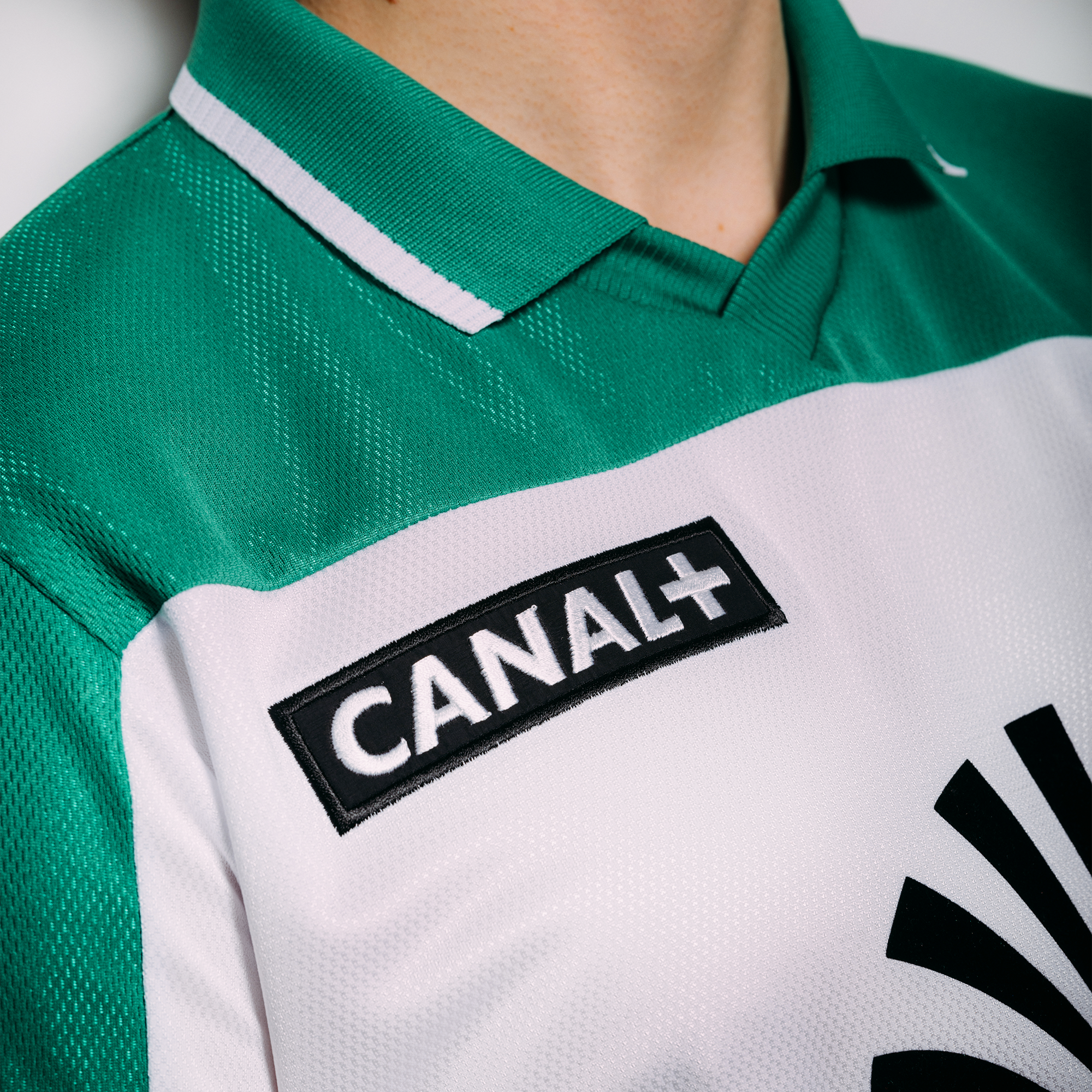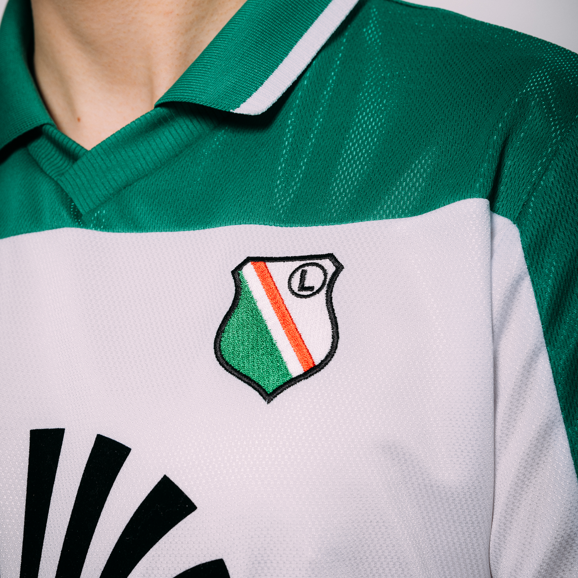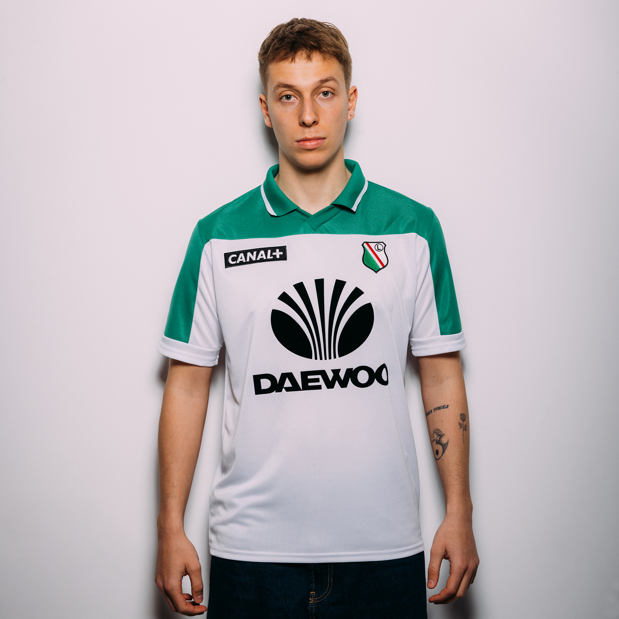 Dominująca biel koszulki doskonale kontrastuje z zielonymi rękawami i kołnierzem, a odtworzone detale sprawiają, że jest wiernym odwzorowaniem modelu z sezonu 2000/2001. Na froncie koszulki wyróżnia się czarne logo sponsora Daewoo, umieszczone centralnie na białym tle. W tamtym czasie była to jedna z najbardziej rozpoznawalnych marek w polskiej piłce. Całość uzupełnia naszywka Canal+, przywołująca wspomnienia z tamtej epoki. Całość dopełnia herb Legii Warszawa, podkreślający tradycję i charakter drużyny.