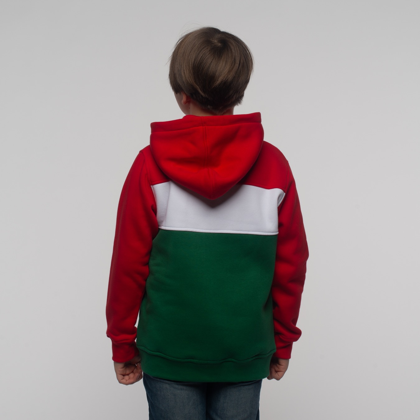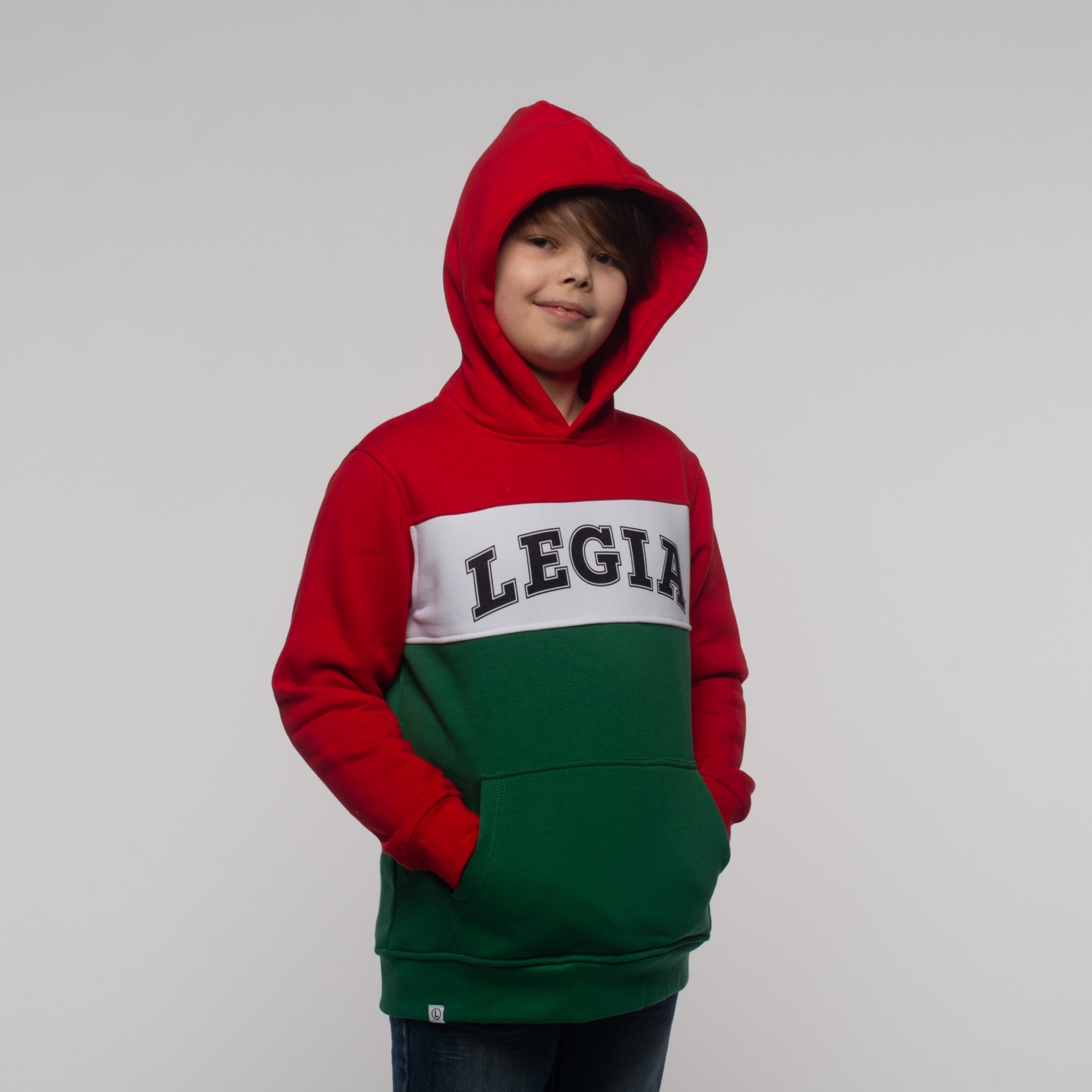 Ta bluza to coś, co dziecko chętnie założy nie tylko na mecz. Miękka, ciepła, z dużą kieszenią i kapturem – sprawdzi się zarówno w szkole, jak i na podwórku. Do tego ma barwy, które każdy fan Legii rozpozna bez problemu: czerwony kaptur i góra, biały pas z napisem LEGIA, a na dole intensywna zieleń.
