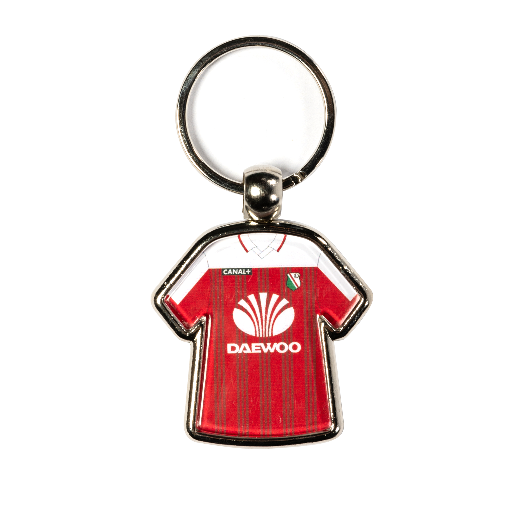 Ten metalowy brelok w kształcie koszulki to wyjątkowy gadżet dla każdego kibica Legii Warszawa. Dominująca czerwień, uzupełniona białymi i zielonymi akcentami, odtwarza detale kultowego stroju z sezonu 2000/2001. Centralnie umieszczone logo sponsora Daewoo oraz naszywka Canal+ przypominają o ważnym okresie w historii klubu. Herb Legii Warszawa na froncie dopełnia całość, podkreślając tradycję i dumę drużyny.
