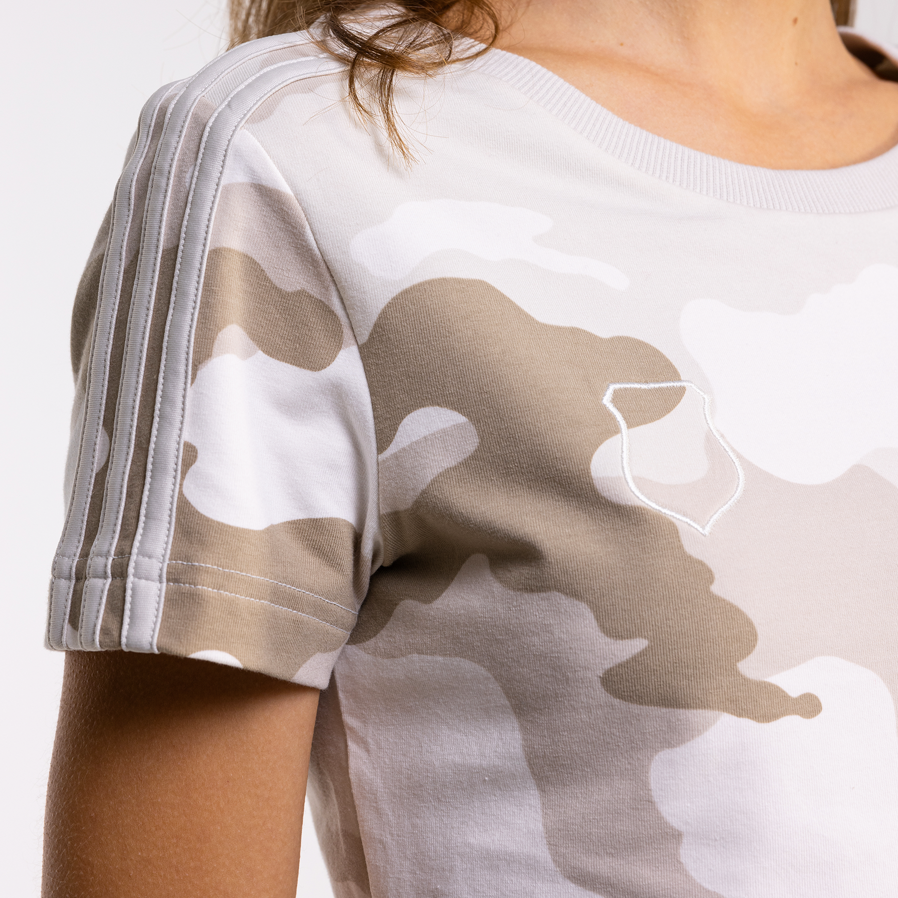 Stylowy crop top adidas z kamuflażowym wzorem i herbem Syrenki. Idealny na co dzień i na wyjścia. Komfort i jakość z Better Cotton. Sprawdź w Legia FanStore!