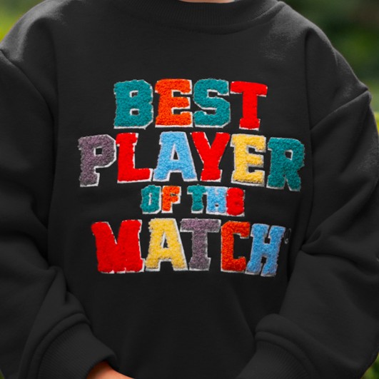 Bluza ma czarny kolor, który świetnie kontrastuje z eksplozją barw i pozytywnej energii na nadruku. Duży napis “BEST PLAYER OF THE MATCH” ułożony z radosnych, kolorowych liter od razu przyciąga wzrok i dodaje energii. To projekt, który emanuje optymizmem i dziecięcą pewnością siebie – w szkole, na podwórku czy w każdej codziennej sytuacji.