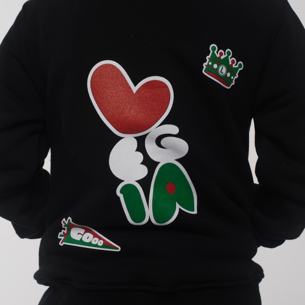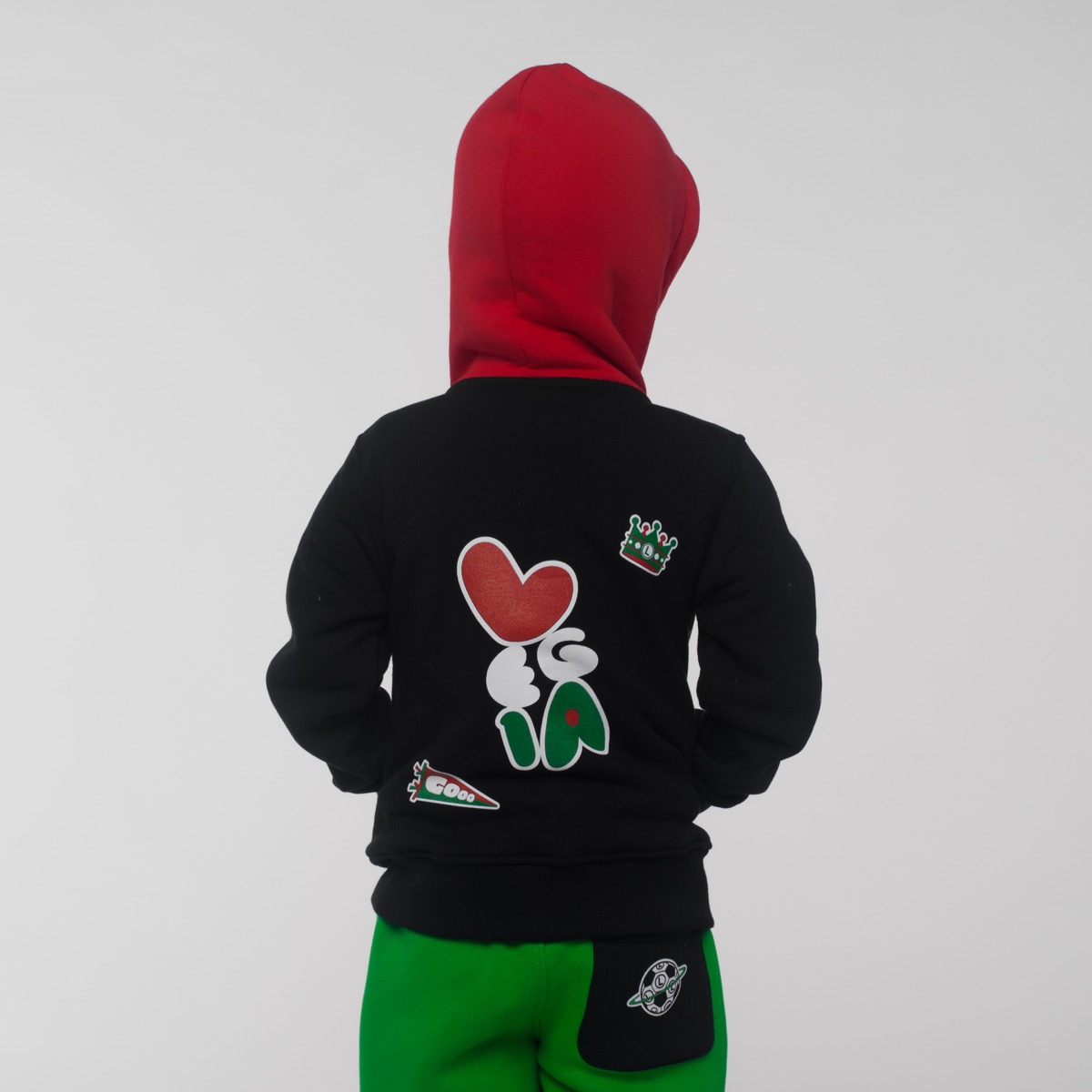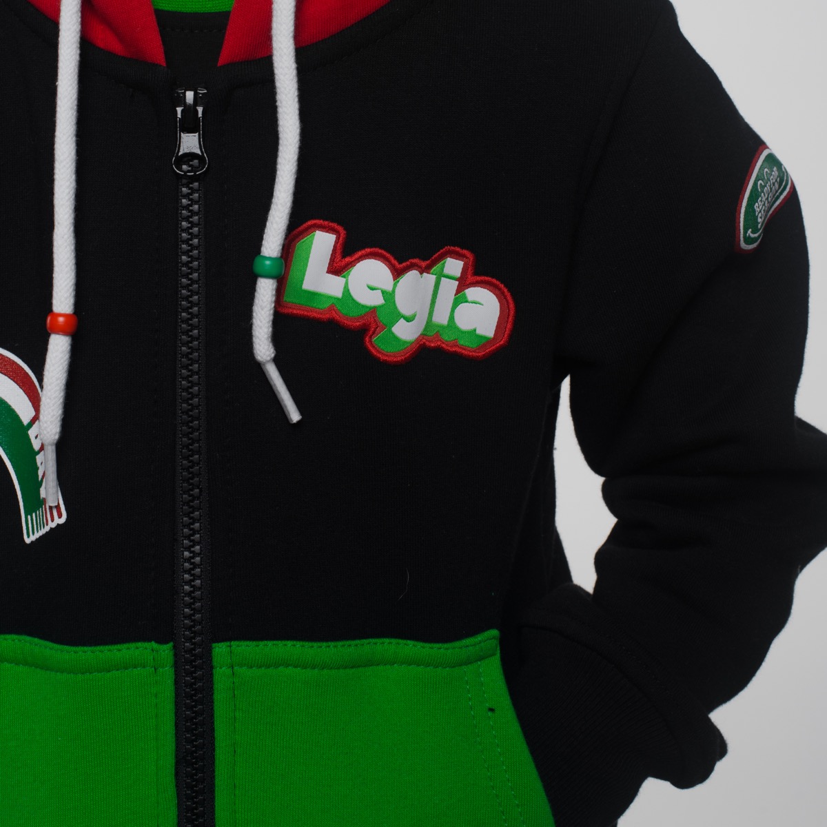 Z przodu znajduje się napis „Legia” w radosnej, dziecięcej typografii, a obok znajduje się napis „Match Day”, który wzmacnia sportowy charakter bluzy i podkreśla jej kibicowski styl. Na rękawie znajdziesz zieloną naszywkę „Ready for season”, a z tyłu duży, efektowny napis „Legia” złożony z elementów przypominających naklejki: serce, korona, rakieta, i litery w barwach klubowych. Te grafiki nie tylko przyciągają wzrok, ale rozbudzają dziecięcą wyobraźnię i tworzą emocjonalną więź z klubem.