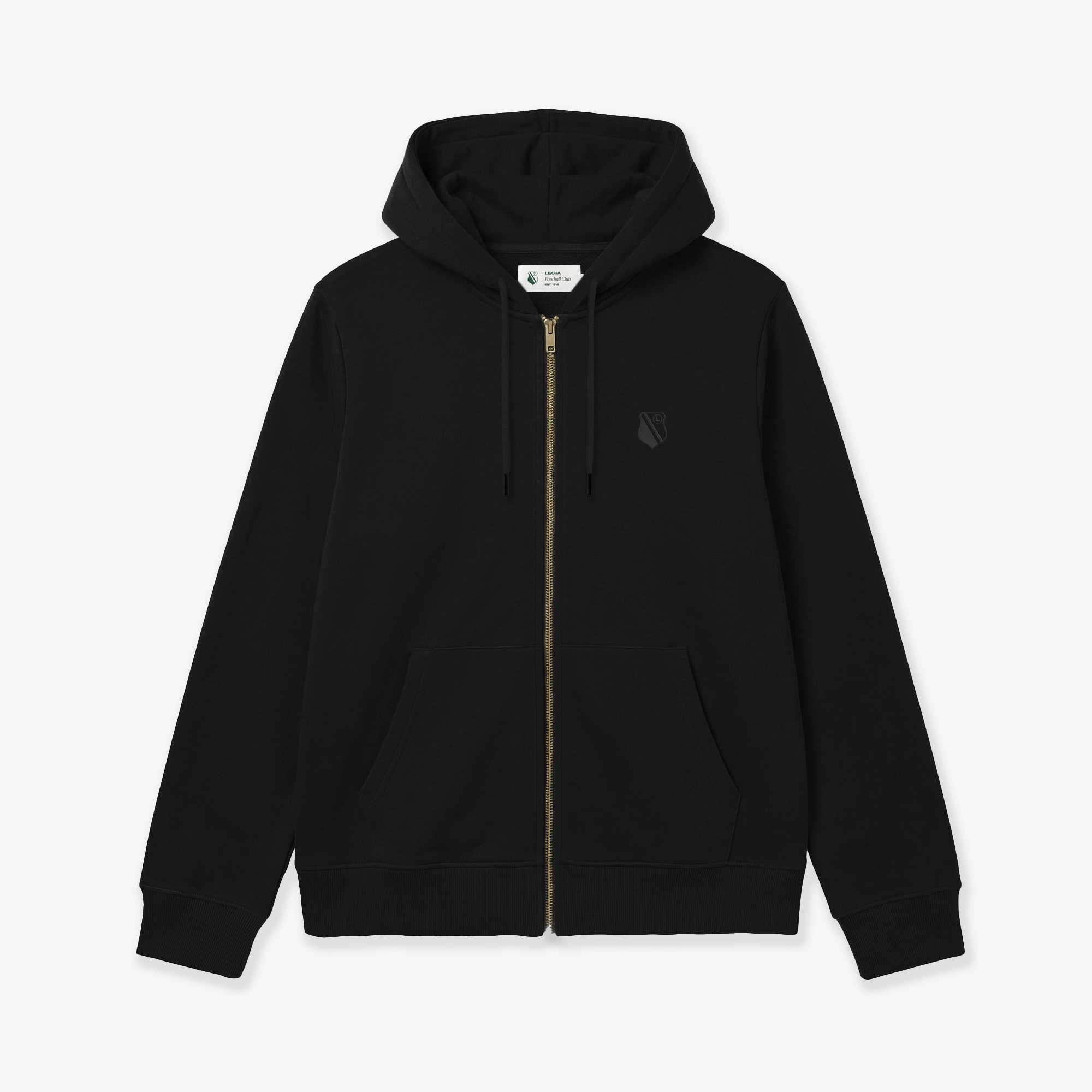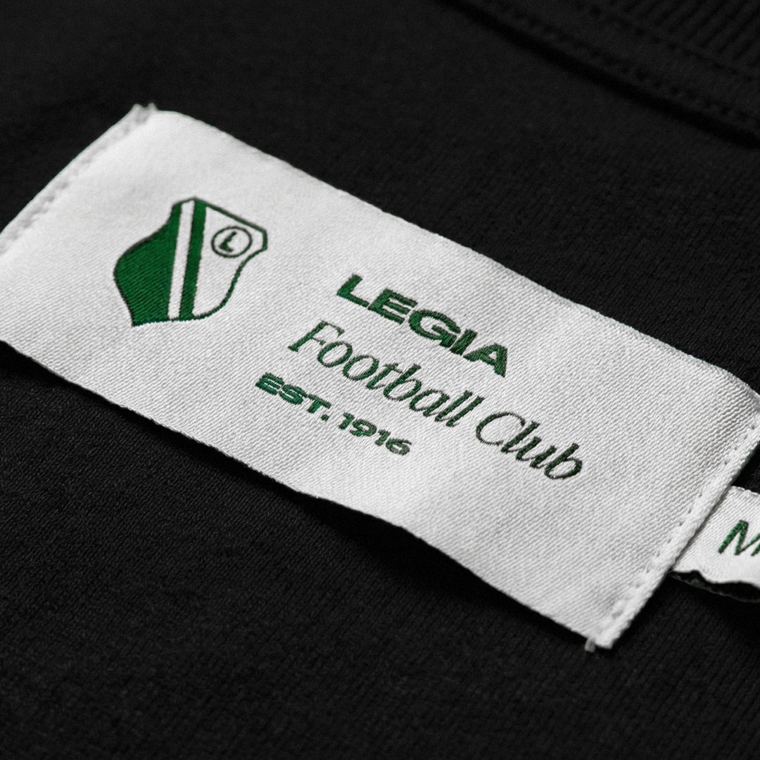 Na lewej piersi znajduje się herb Legii Warszawa w wersji tonalnej – wyhaftowany czarną nicią na czarnym tle. Jest widoczny dla tych, którzy wiedzą, gdzie patrzeć. To nowoczesny, “miejski” sposób na noszenie barw. Monotonię czerni przełamuje solidny, metalowy zamek w kolorze złota. Ten jeden detal dodaje całości charakteru i sprawia, że bluza nie jest nudna.