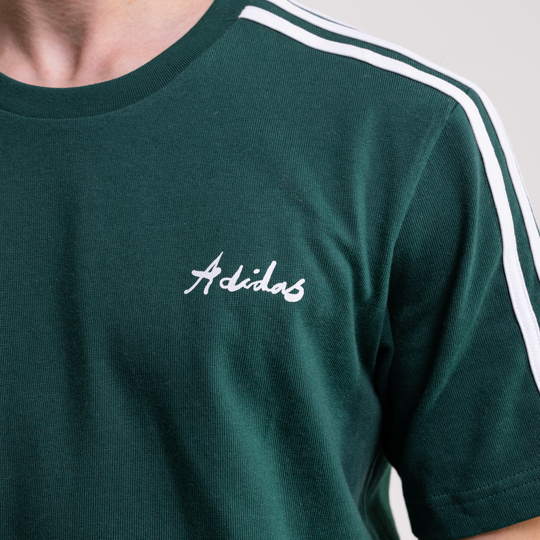 Na klatce piersiowej umieszczono subtelny, odręcznie stylizowany napis “adidas” oraz “eLkę” w kółeczku, w koronie, w eleganckim haftowanym wykończeniu. Białe detale kontrastują z głęboką, zieloną kolorystyką tkaniny, nadając całości klasyczny, ale jednocześnie sportowy charakter.