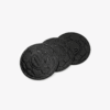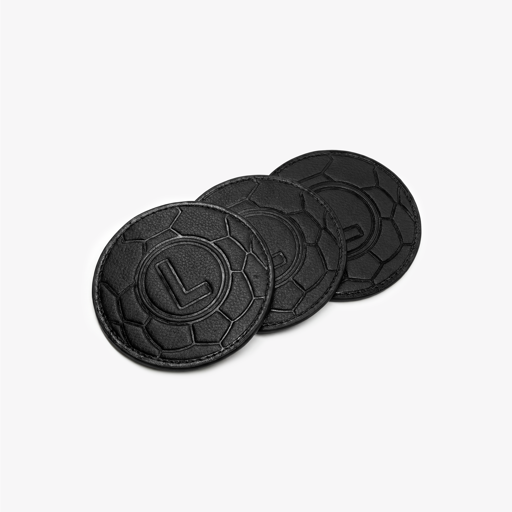 Materiał i Faktura: Podkładki wykonane są z wysokiej jakości skóry naturalnej w kolorze czarnym. Ich okrągły kształt i unikalna, wytłoczona faktura subtelnie nawiązują do motywów sportowych.