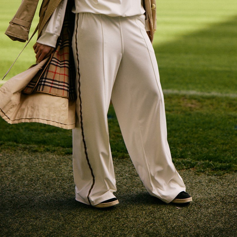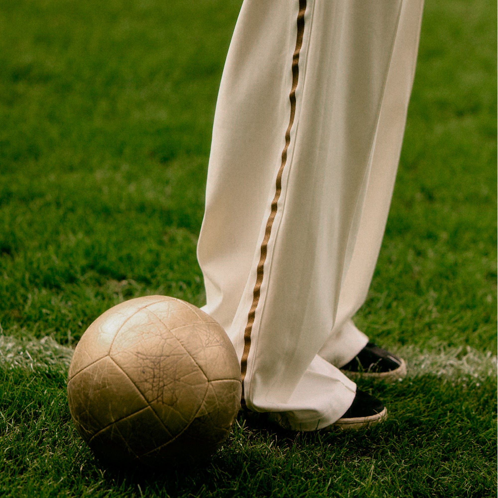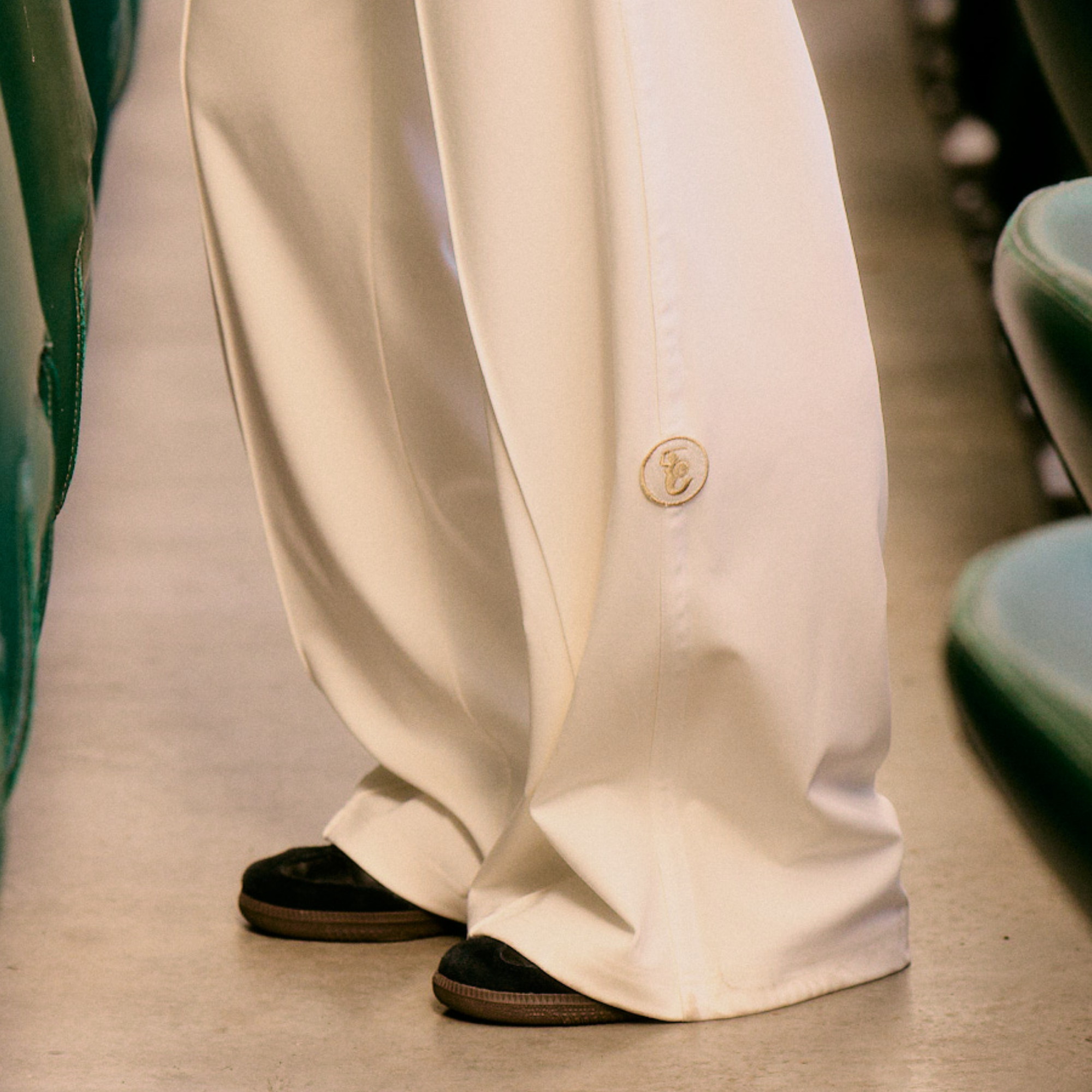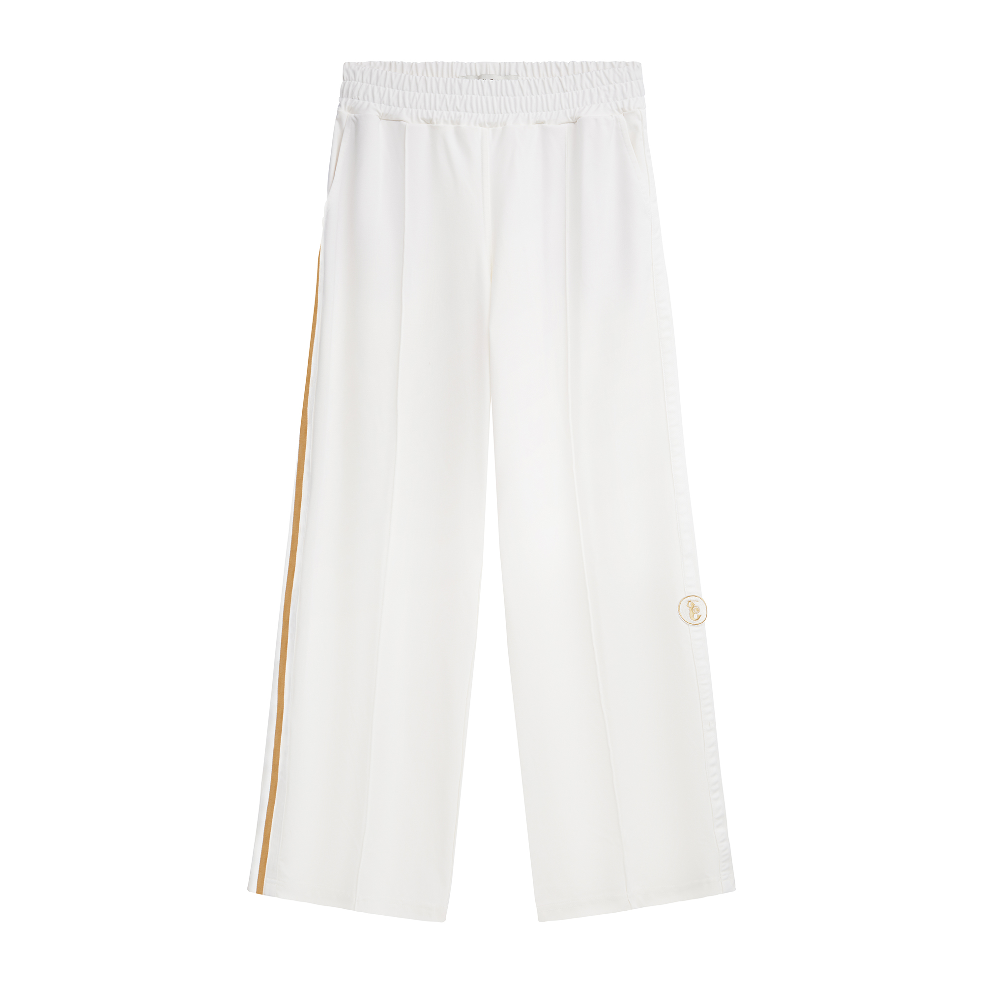 - Subtelne lamówki w odcieniu ecru i złotym pasem na prawej nogawce podkreślają luksusowy design.