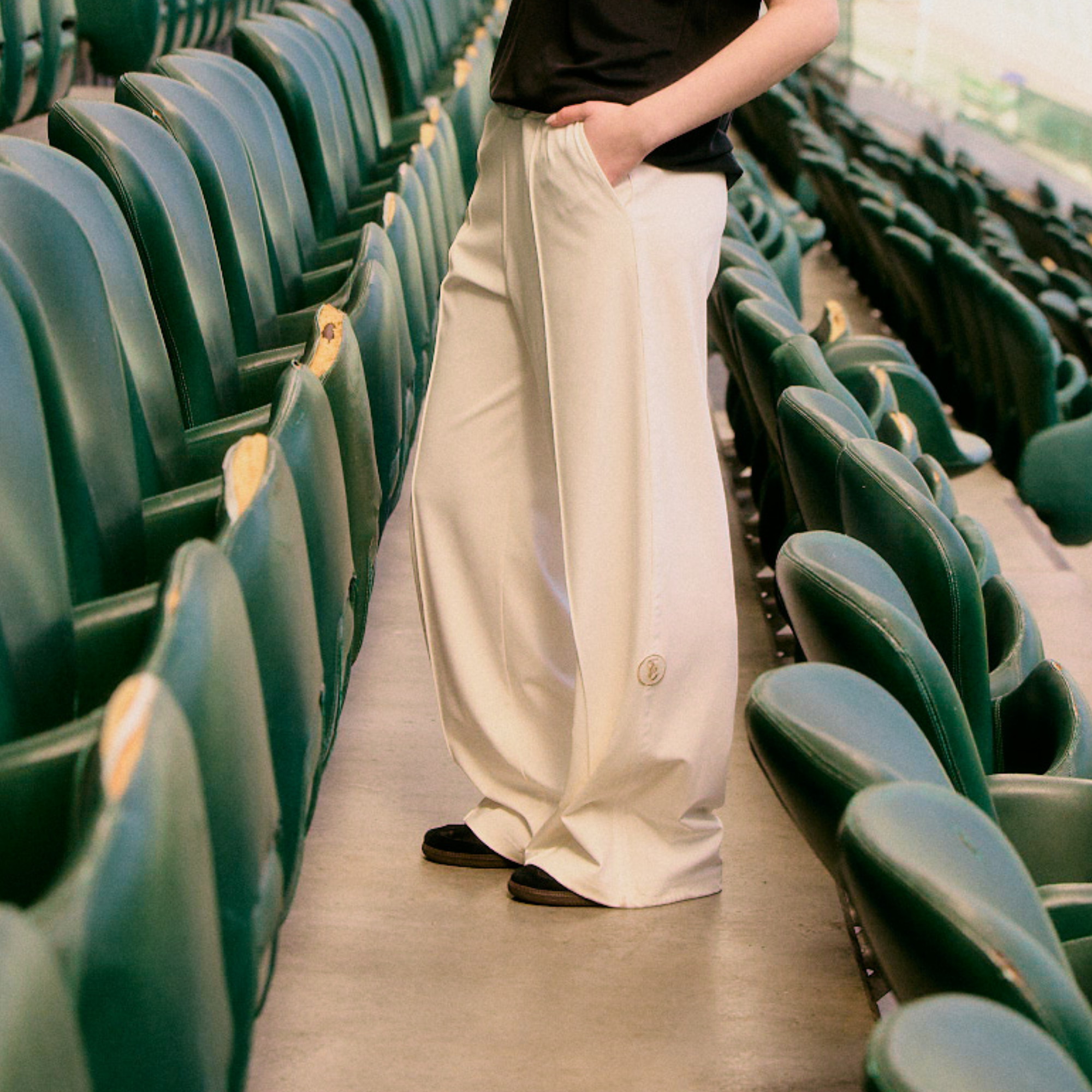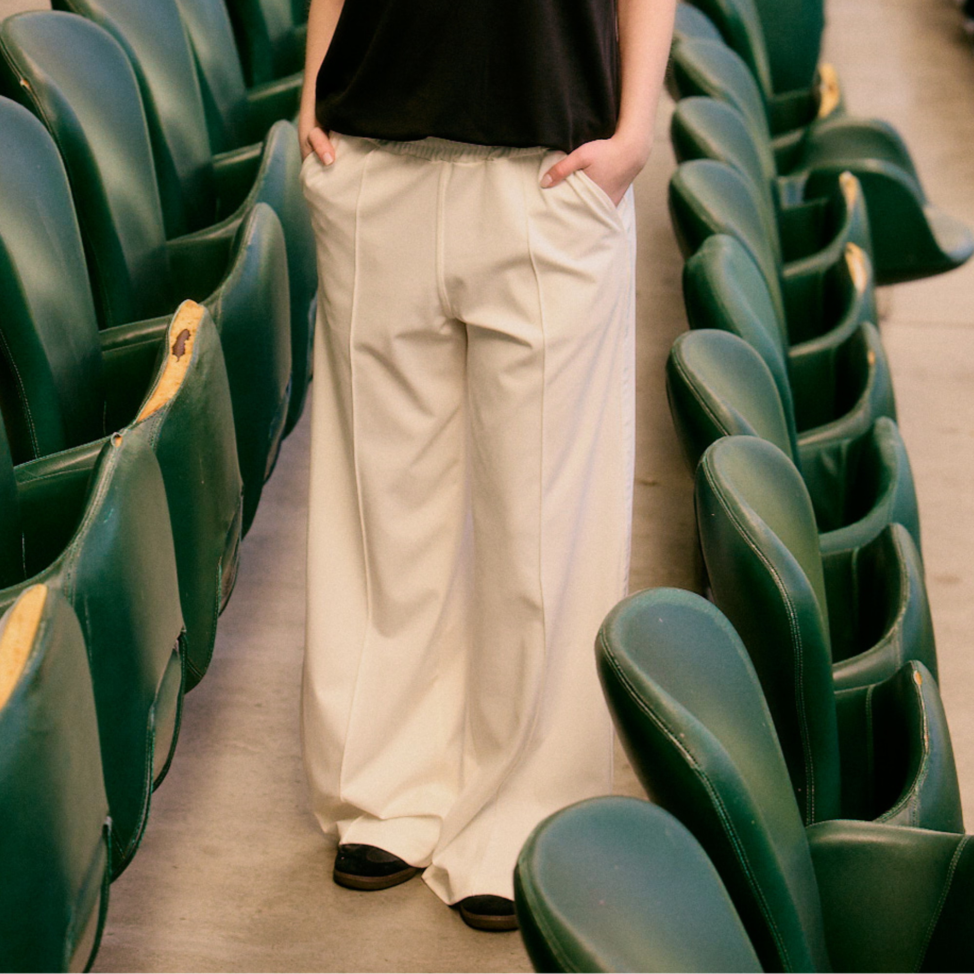 - Konstrukcja: Szeroka guma w pasie, szeroka nogawka, subtelne lamówki, emblemat Syrenki.