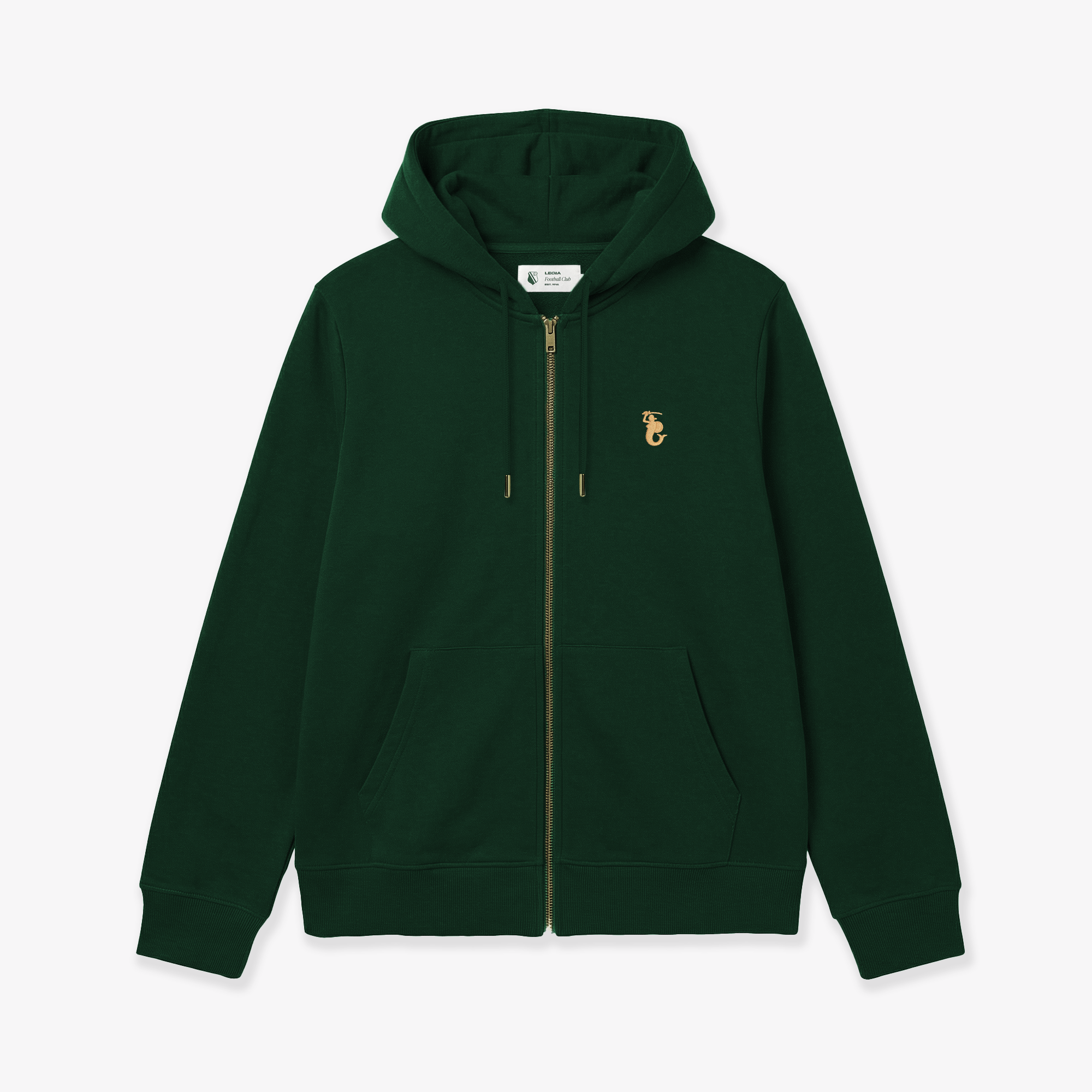 W tym modelu postawiliśmy na kontrast, który każdy kibic Legii zna i lubi. Na tle ciemnej zieleni błyszczą dwa elementy. Pierwszy to złoty, metalowy zamek, który działa płynnie i solidnie, dodając całości charakteru. Drugi to starannie wyhaftowana złota Syrenka na lewej piersi. To dyskretny, ale wyraźny sygnał, komu kibicujesz. Reszta jest czysta – żadnych krzykliwych napisów na plecach.