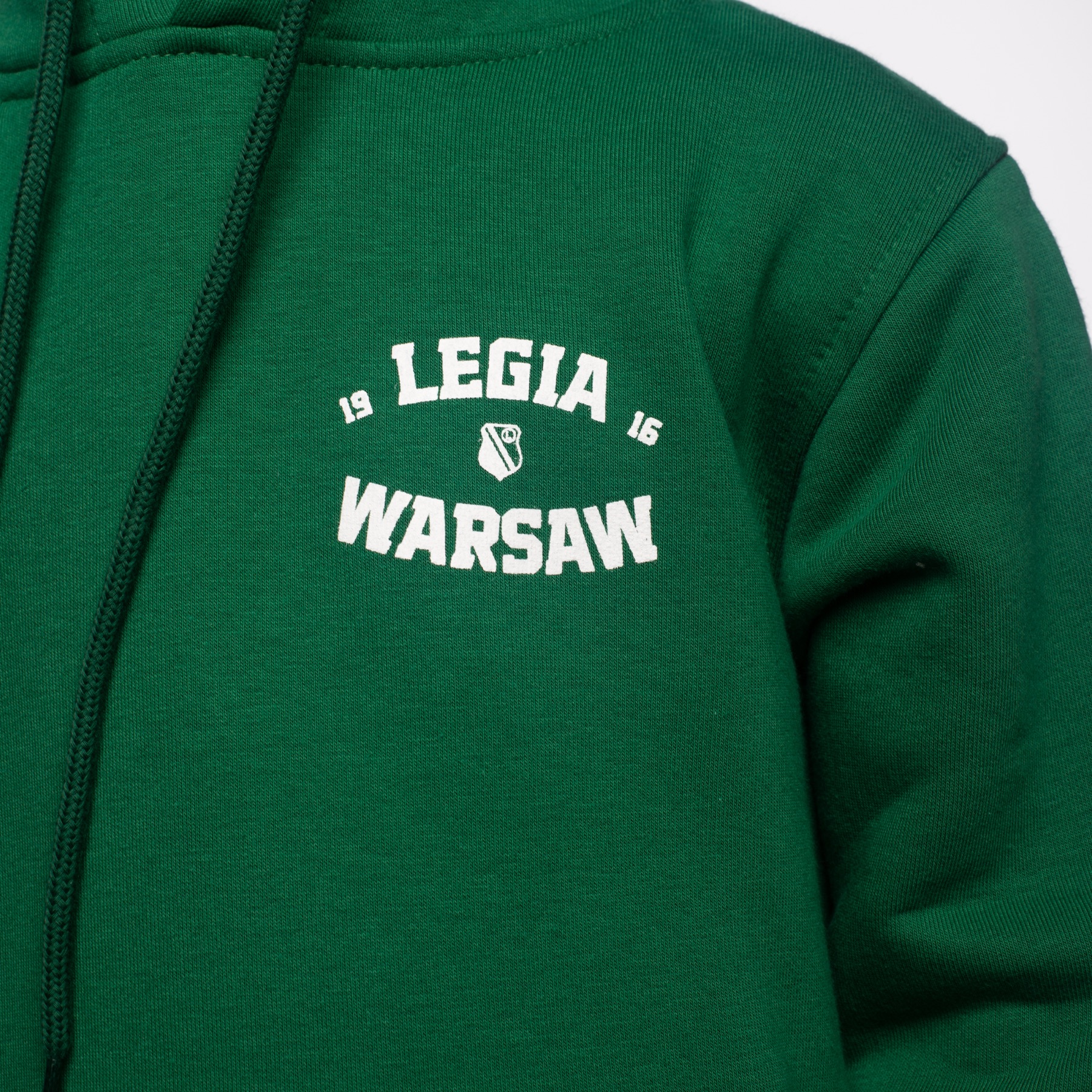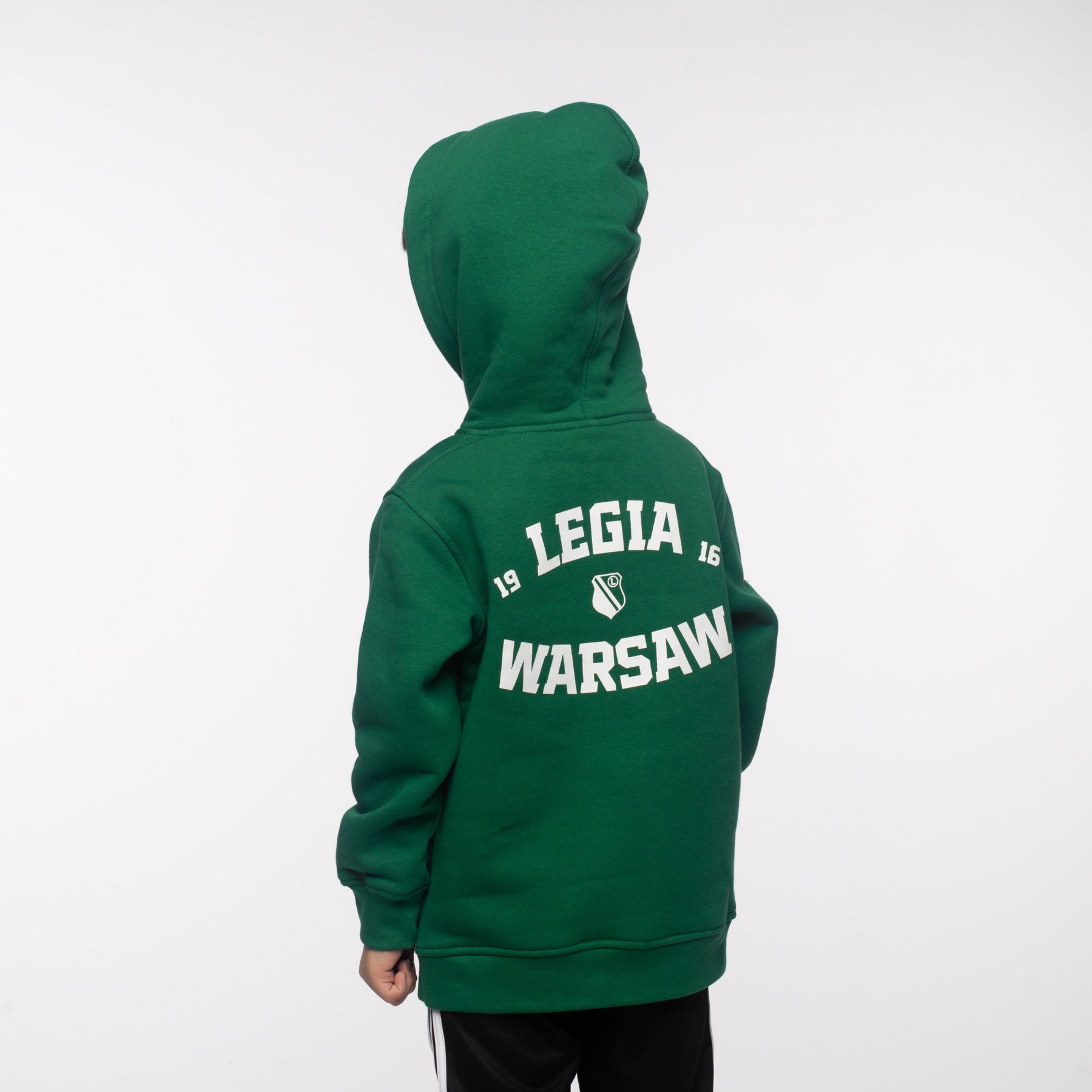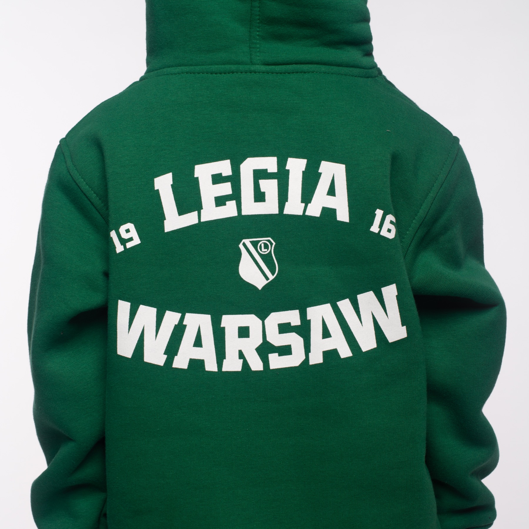 Z przodu bluzy jest mniejszy nadruk z napisem LEGIA WARSAW, herbem i rokiem 1916 – to dyskretny akcent, który dziecko może nosić na co dzień. A z tyłu? Duży, wyrazisty napis z tymi samymi elementami, który przyciąga uwagę i pozwala dziecku poczuć dumę z kibicowania Legii – bez konieczności mówienia czegokolwiek.